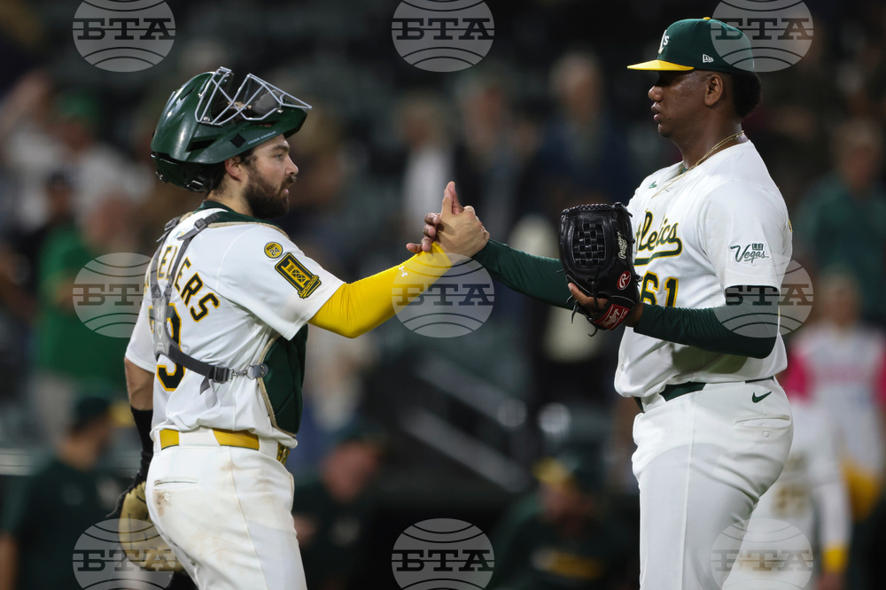 Athletics pitcher Elvis Alvarado, right, and catcher Shea Langeliers celebrate their victory over the Houston Astros in a baseball game Wednesday, Sept. 24, 2025, in West Sacramento, Calif. (AP Photo/Scott Marshall)