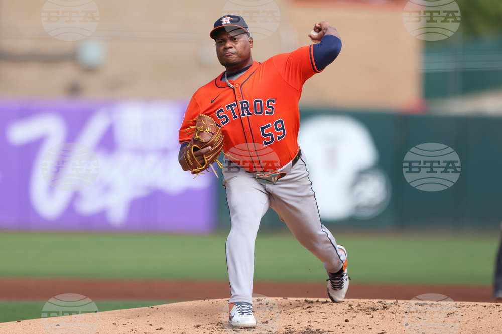Houston Astros pitcher Framber Valdez throws to an Athletics batter during the third inning of a baseball game Thursday, Sept. 25, 2025, in West Sacramento, Calif. (AP Photo/Scott Marshall)