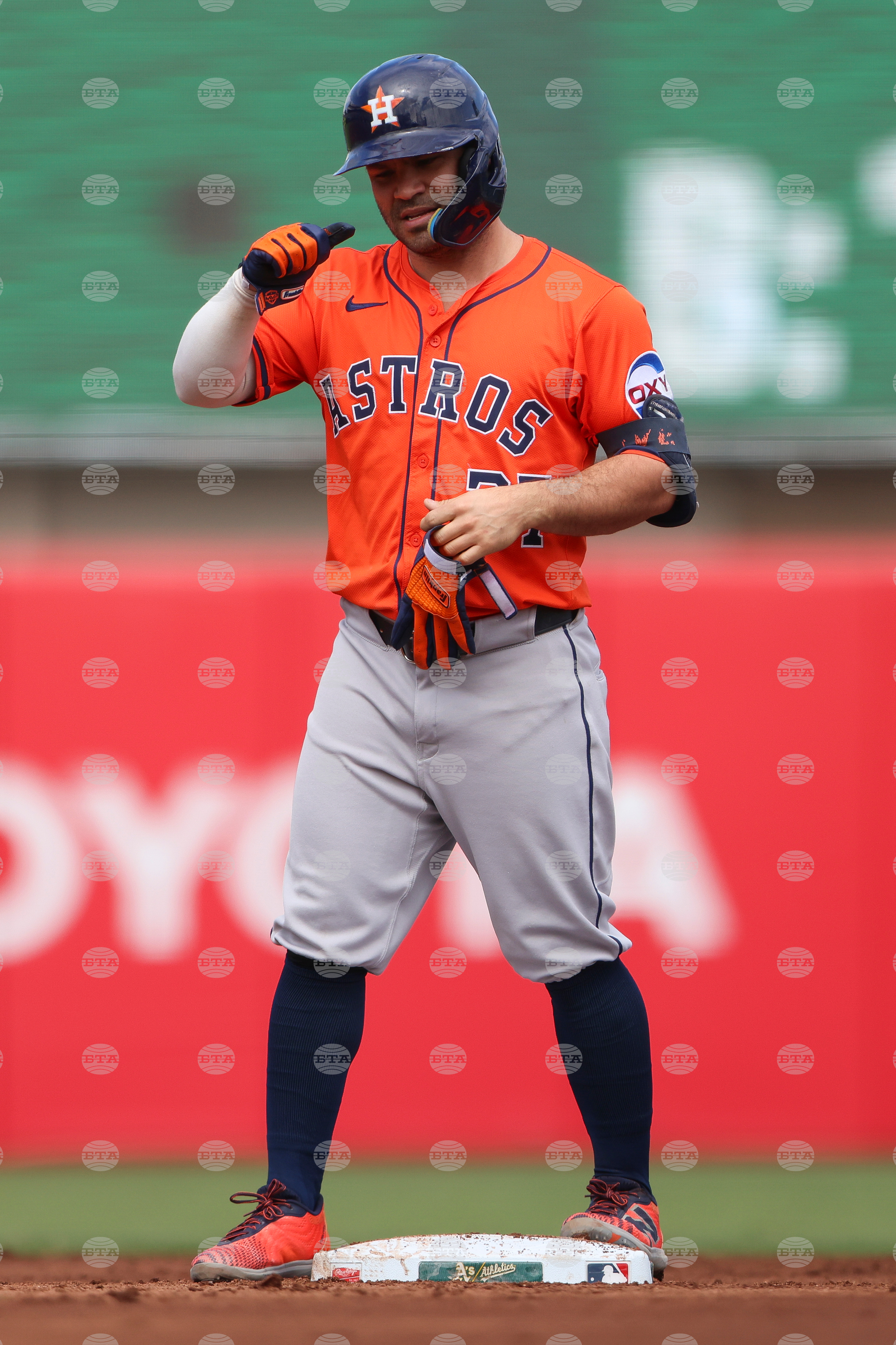 Houston Astros' Jose Altuve reacts after hitting an RBI double during the second inning of a baseball game against the Athletics, Thursday, Sept. 25, 2025, in West Sacramento, Calif. (AP Photo/Scott Marshall)