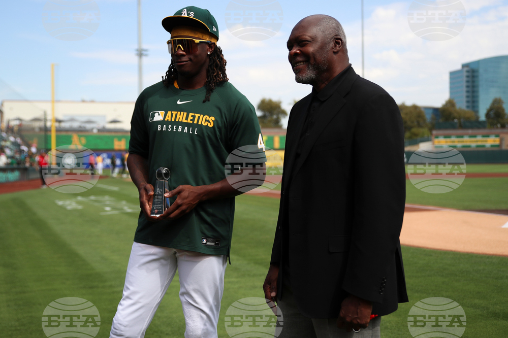 Athletics' Lawrence Butler, left, accept a Dave Stewart community service award as he stands next to Dave Stewart before a baseball game against the Houston Astros, Thursday, Sept. 25, 2025, in West Sacramento, Calif. (AP Photo/Scott Marshall)