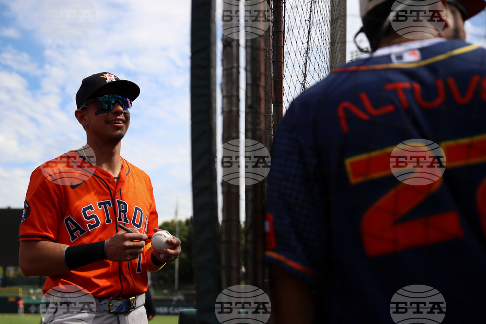 Houston Astros' Mauricio Dubón signs an autograph for a fan before a baseball game against the Athletics, Thursday, Sept. 25, 2025, in West Sacramento, Calif. (AP Photo/Scott Marshall)