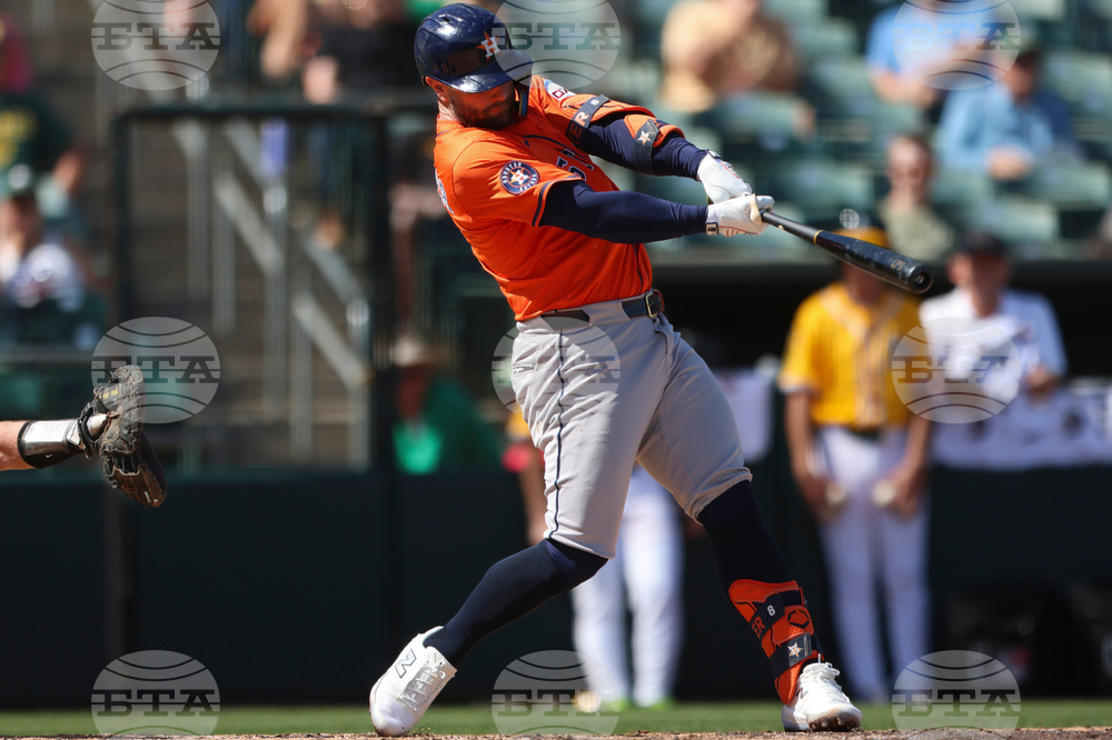 Houston Astros' Carlos Correa hits an RBI double during the seventh inning of a baseball game against the Athletics, Thursday, Sept. 25, 2025, in West Sacramento, Calif. (AP Photo/Scott Marshall)