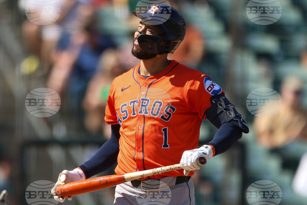 Houston Astros' Carlos Correa reacts after striking out during the fourth inning of a baseball game against the Athletics, Thursday, Sept. 25, 2025, in West Sacramento, Calif. (AP Photo/Scott Marshall)