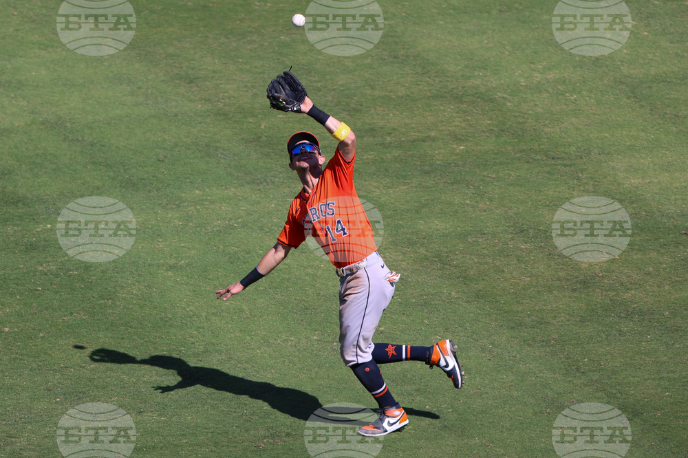 Houston Astros shortstop Mauricio Dubón catches a fly ball for the final out of the fifth inning of a baseball game against the Athletics, Thursday, Sept. 25, 2025, in West Sacramento, Calif. (AP Photo/Scott Marshall)