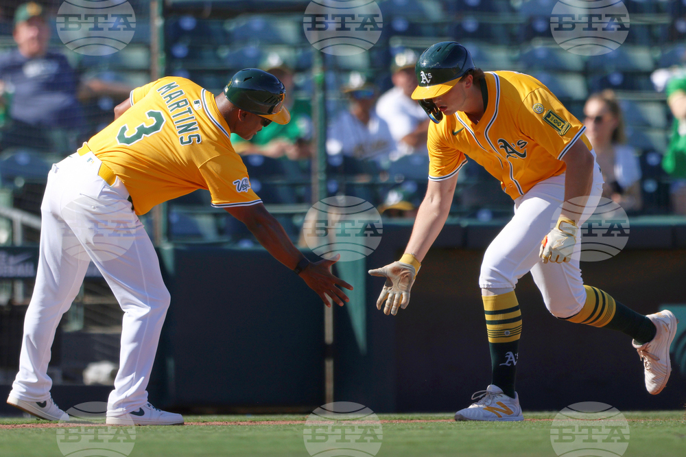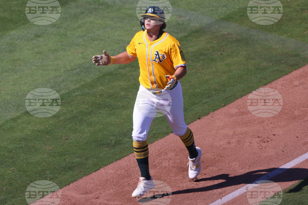Athletics' Tyler Soderstrom jogs around the bases after hitting a solo home run during the seventh inning of a baseball game against the Houston Astros, Wednesday, Sept. 24, 2025, in West Sacramento, Calif. (AP Photo/Scott Marshall)
