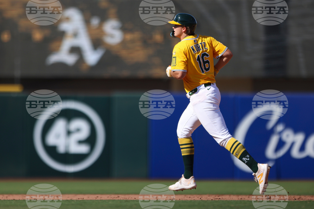 Athletics' Nick Kurtz jogs around the bases after hitting a solo home run during the sixth inning of a baseball game against the Houston Astros, Thursday, Sept. 25, 2025, in West Sacramento, Calif. (AP Photo/Scott Marshall)