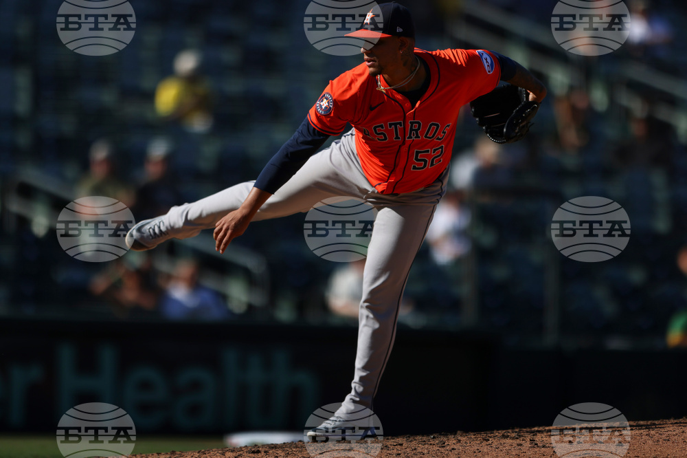 Houston Astros pitcher Bryan Abreu throws to an Athletics batter during the ninth inning of a baseball game Thursday, Sept. 25, 2025, in West Sacramento, Calif. (AP Photo/Scott Marshall)