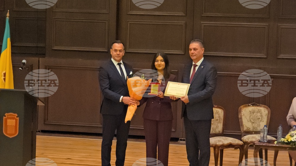 Добрич (25 септември 2025) Председателят на Фондация „Милостиво сърце“ Александър Иванов и собственикът и изпълнителен директор на „Добруджански хляб“ АД Енчо Малев бяха удостоени със званието "Почетен гражданин" на Добрич на тържествено заседание на Общинския съвет по случай празника на града. На снимката (от ляво надясно): кметът на Добрич Йордан Йорданов, "Ученик на годината" дванадесетокласничката Ралица Йорданова и председателят на Общински съвет Добрич Красимир Николов.