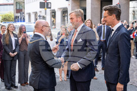 Münster's Lord Mayor Markus Lewe, left, shakes hands with Dutch King Willem-Alexander, at the House of the Netherlands in Muenster, Germany, Thursday Sept. 25, 2025. (Guido Kirchner/dpa via AP)