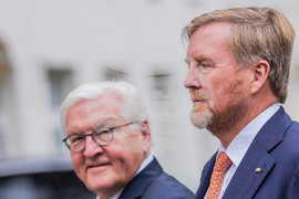 Dutch King Willem-Alexander, left, and German President Frank-Walter Steinmeier arrive at Wilkinghege Palace in Muenster, Germany, Thursday Sept. 25, 2025. (Rolf Vennenbernd/dpa via AP)