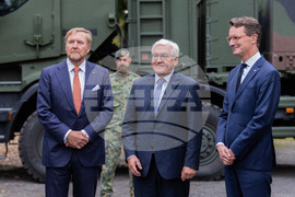 Dutch King Willem-Alexander, left, German President Frank-Walter Steinmeier, center, and Hendrik Wüst, Minister President of North Rhine-Westphalia, inspect military equipment during a visit to the German-Dutch Corps. in Muenster, Germany, Thursday Sept. 25, 2025. (Rolf Vennenbernd/dpa via AP)