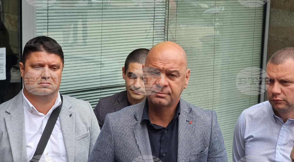 Пловдив (25 септември 2025) Пред сградата на кметството на район "Южен" в Пловдив се провежда брифинг след срещата между представители на общината и представители на ВиК - Пловдив във връзка с проблемите за реализирането на проекта за Южен обходен колектор на града. На снимката: кметът на Пловдив Костадин Димитров (в средата).