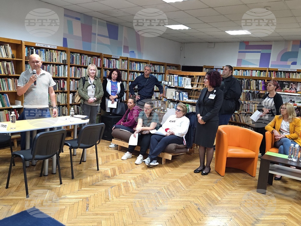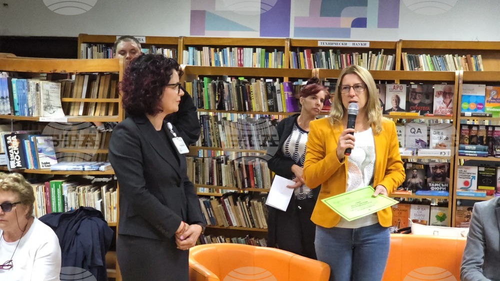 Видин (25 септември 2025) Работодатели представят дейността си и обявяват свободните работни места, за които търсят служители, по време на третата за 2025 г. трудова борса, организирана от „Бюро по труда“ във Видин. На снимката (от ляво надясно): директорът на Дирекция „Бюро по труда“ във Видин Александра Рачева и директорът на Регионална библиотека „Михалаки Георгиев“ Десислава Иванова.