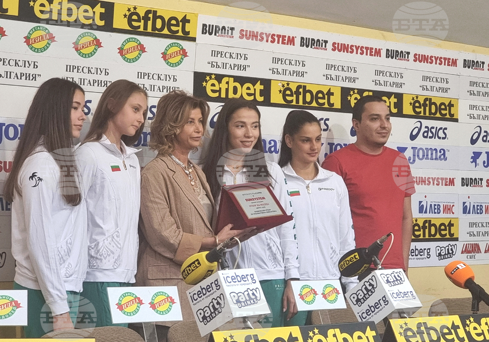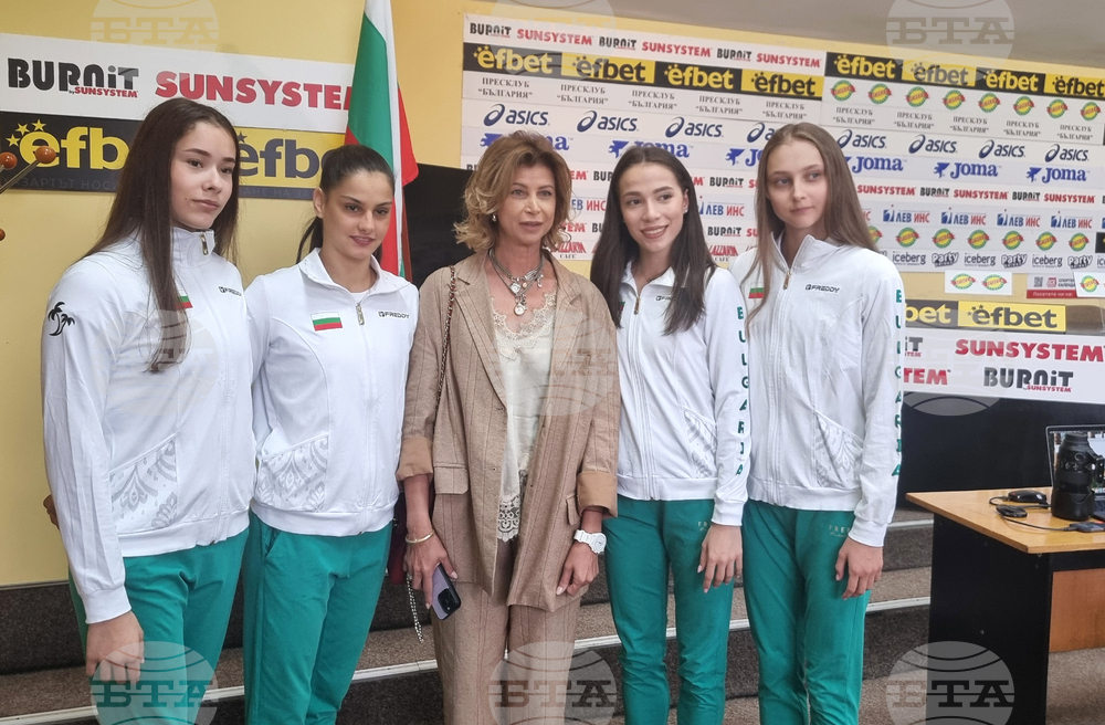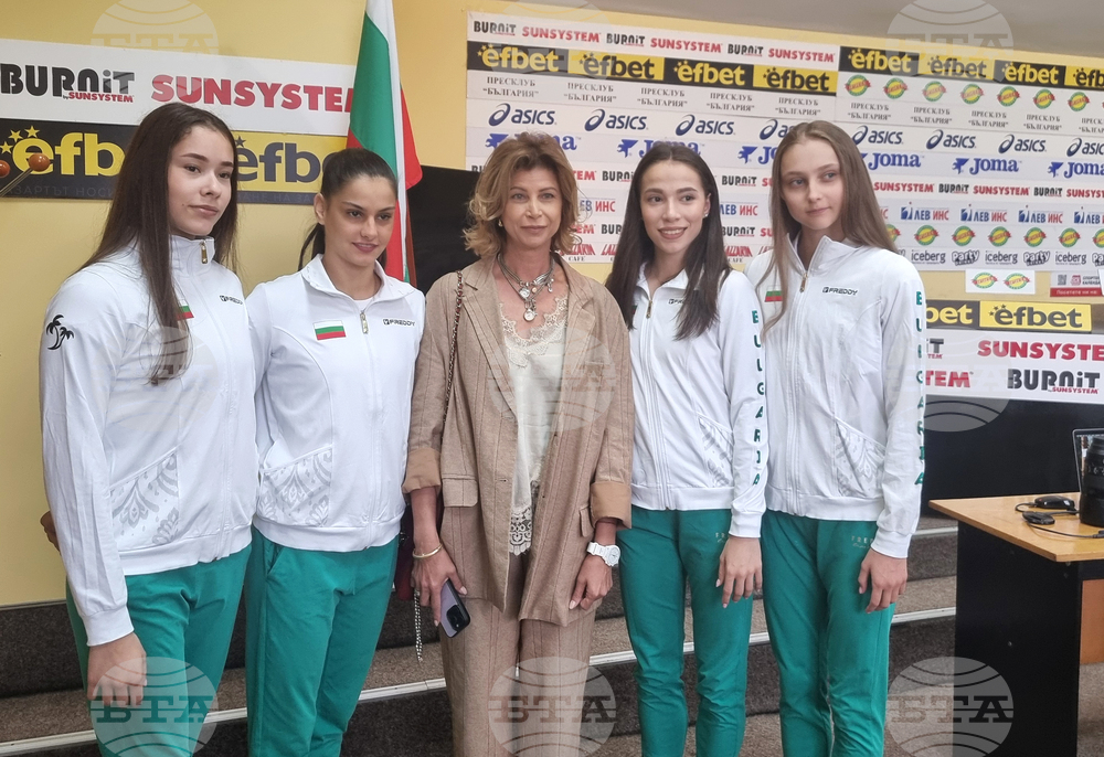 София (25 септември 2025) В пресклуб “България” се провежда пресконференция на националния ансамбъл по художествена гимнастика. На снимката (от ляво надясно): Даная Атанасова, Емилия Обретенова, старши треньорът на българския ансамбъл по художествена гимнастика Весела Димитрова, София Иванова, Алина Коломиец.