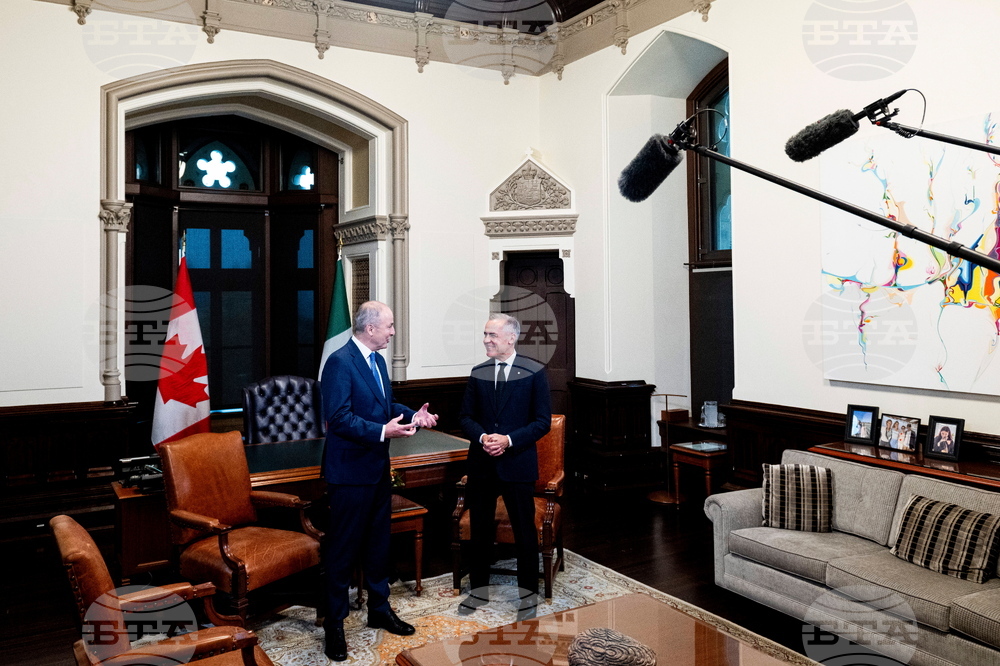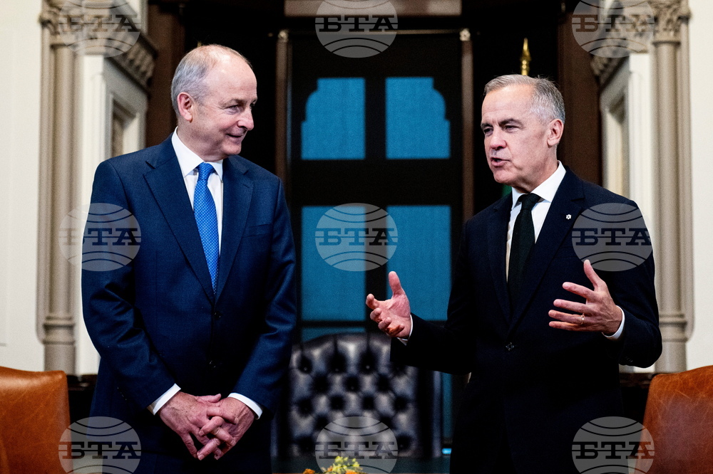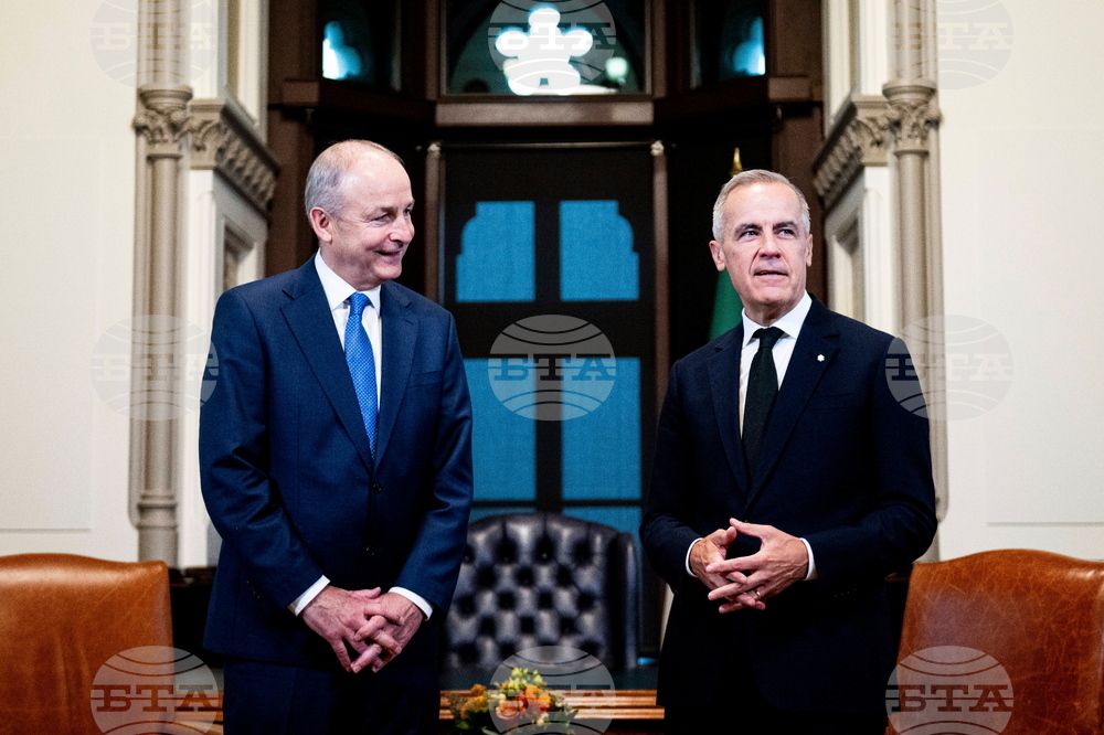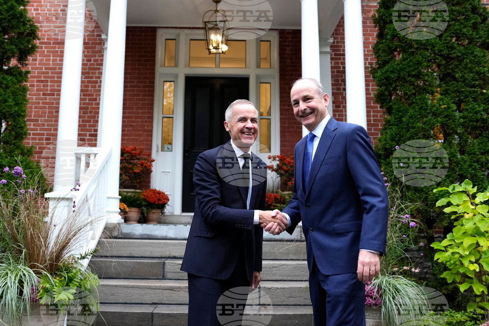 Prime Minister Mark Carney meets Micheal Martin, Taoiseach of Ireland, at his residence at Rideau Cottage in Ottawa on Thursday, Sept. 25, 2025. (Justin Tang /The Canadian Press via AP)