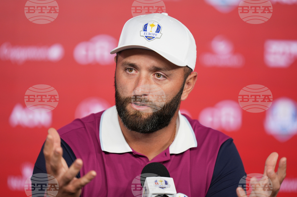 Europe's Jon Rahm speaks during a news conference at the Ryder Cup golf tournament, Thursday, Sept. 25, 2025, on the Bethpage Black golf course, in Farmingdale, N.Y. (AP Photo/Seth Wenig)