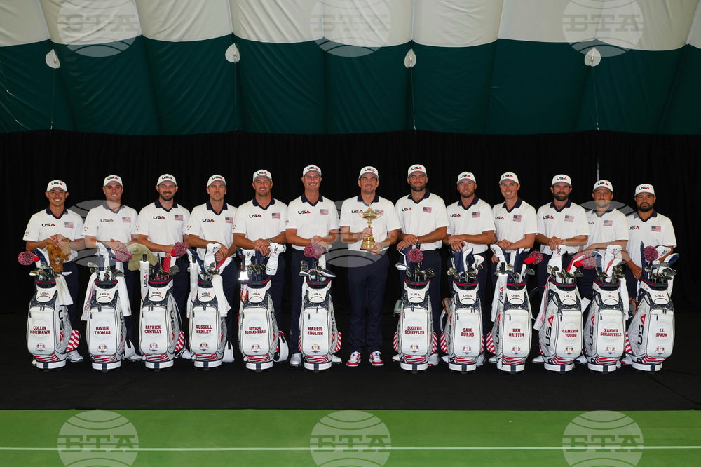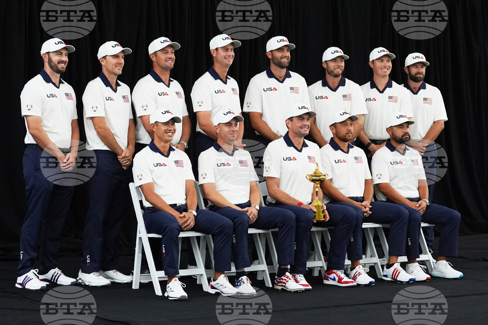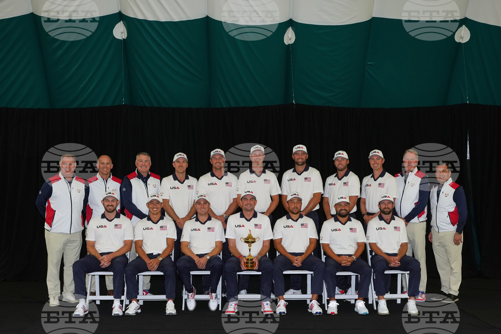 The United States poses for a team picture at the Ryder Cup golf tournament, Thursday, Sept. 25, 2025, on the Bethpage Black golf course, in Farmingdale, N.Y. (AP Photo/Robert Bukaty)