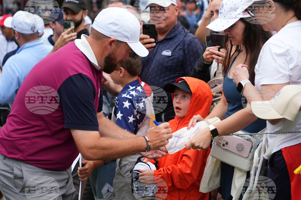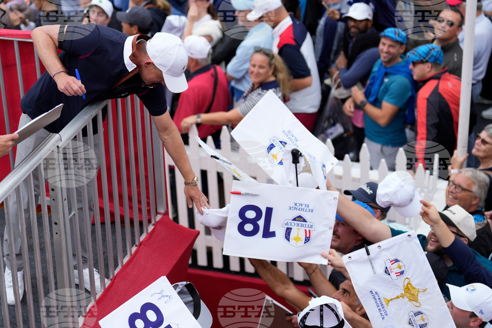 Europe's Shane Lowry signs during a practice round at the Ryder Cup golf tournament, Thursday, Sept. 25, 2025, on the Bethpage Black golf course, in Farmingdale, N.Y. (AP Photo/Lindsey Wasson)