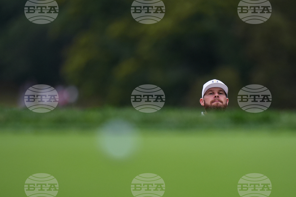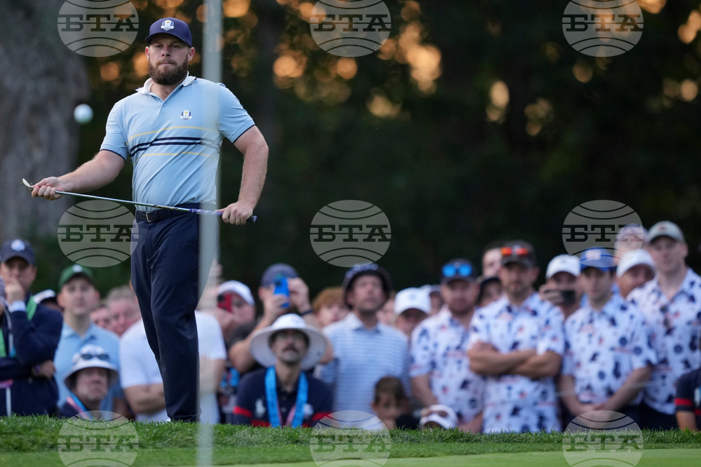 Tyrrell Hatton lines up a shot on the third hole during a practice round at the Ryder Cup golf tournament, Thursday, Sept. 25, 2025, on the Bethpage Black golf course, in Farmingdale, N.Y. (AP Photo/Seth Wenig)