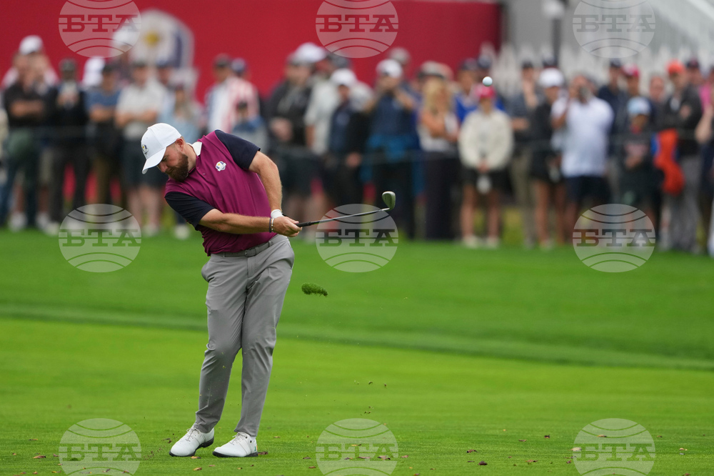 Europe's Shane Lowry hits from the fairway on the first hole during a practice round at the Ryder Cup golf tournament, Thursday, Sept. 25, 2025, on the Bethpage Black golf course, in Farmingdale, N.Y. (AP Photo/Lindsey Wasson)