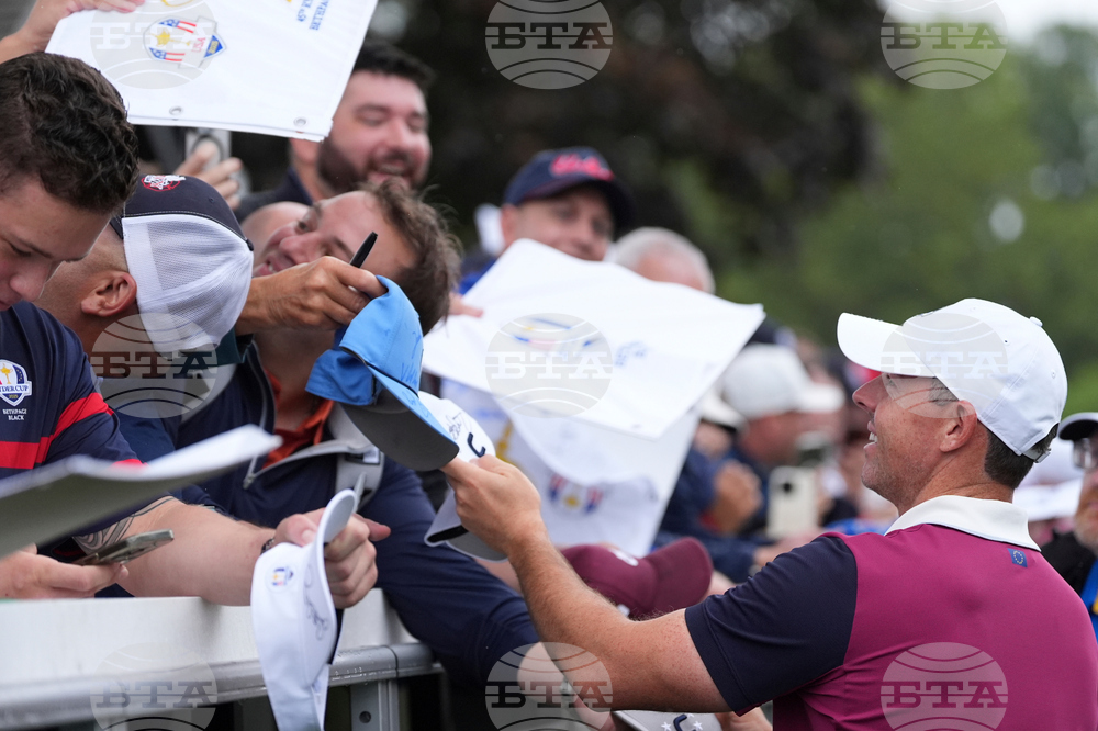 Europe's Rory McIlroy signs during a practice round at the Ryder Cup golf tournament, Thursday, Sept. 25, 2025, on the Bethpage Black golf course, in Farmingdale, N.Y. (AP Photo/Lindsey Wasson)