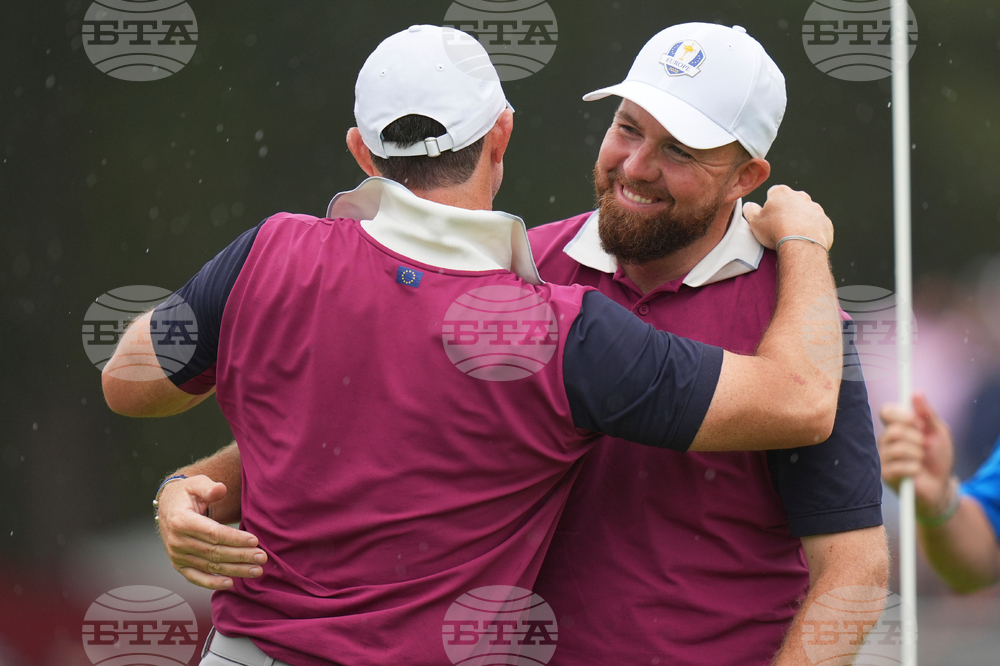 Europe's Robert MacIntyre and Viktor Hovland celebrate on the third hole at Bethpage Black golf course during the Ryder Cup golf tournament, Friday, Sept. 26, 2025, in Farmingdale, N.Y. (AP Photo/Robert Bukaty)