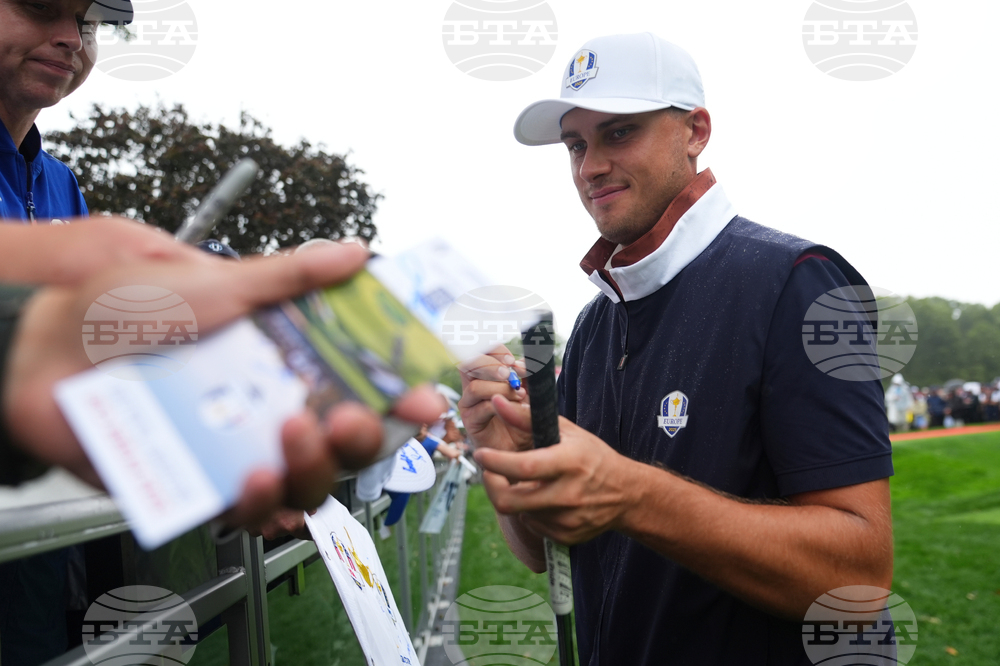 Europe's Tommy Fleetwood signs on the second hole during a practice round at the Ryder Cup golf tournament, Thursday, Sept. 25, 2025, on the Bethpage Black golf course, in Farmingdale, N.Y. (AP Photo/Seth Wenig)