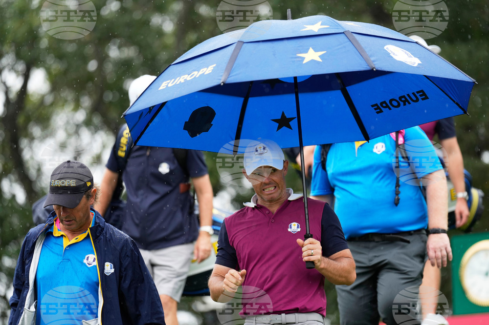 Europe's Rory McIlroy makes his way down a rain soaked hill during a practice round at the Ryder Cup golf tournament, Thursday, Sept. 25, 2025, on the Bethpage Black golf course, in Farmingdale, N.Y. (AP Photo/Seth Wenig)