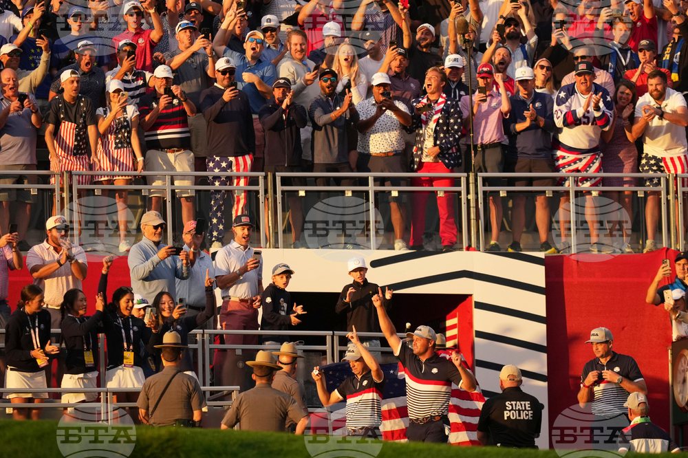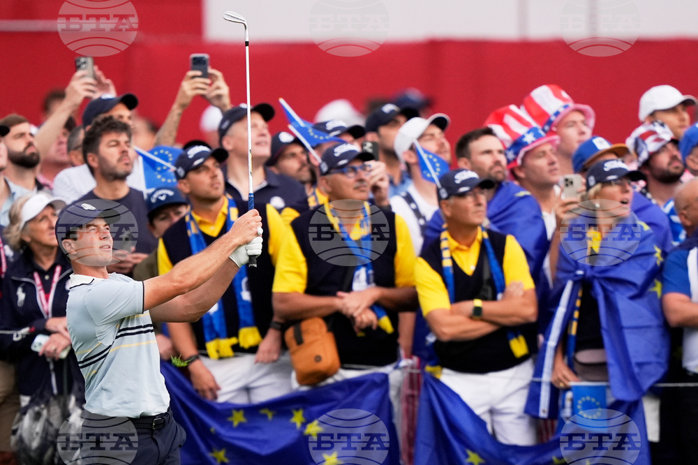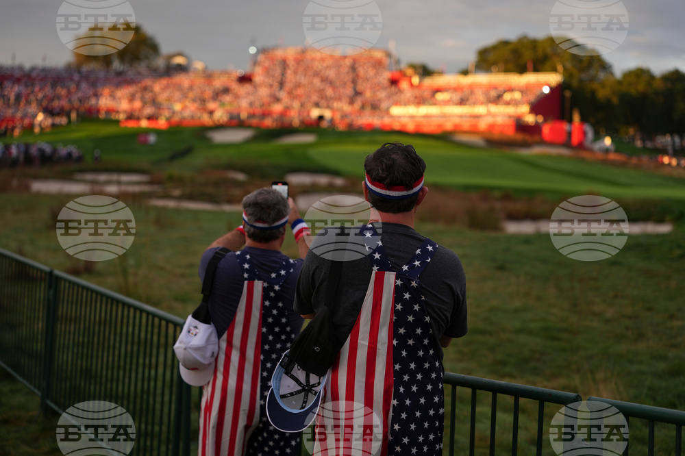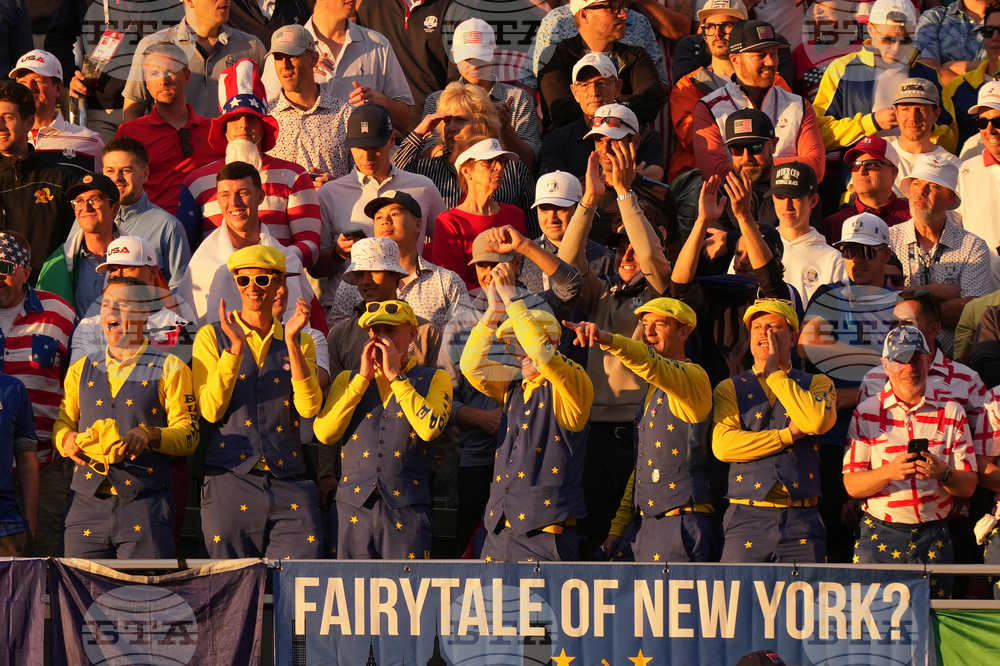 Fans watch as Europe warms up before a practice round at the Ryder Cup golf tournament, Thursday, Sept. 25, 2025, on the Bethpage Black golf course, in Farmingdale, N.Y. (AP Photo/Seth Wenig)