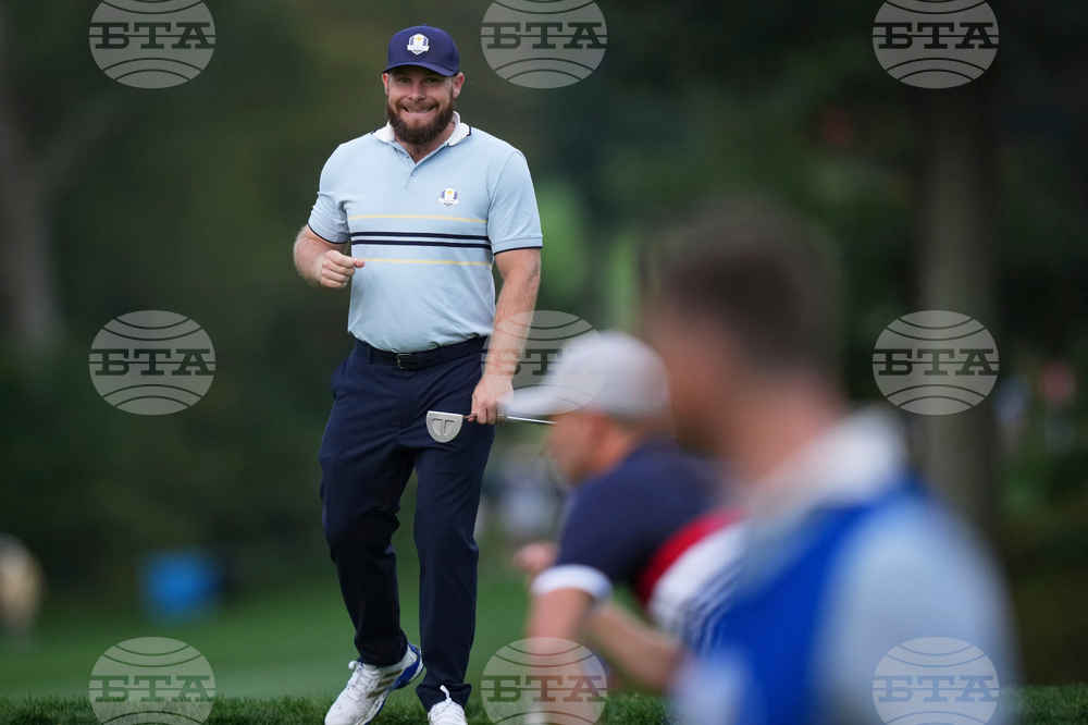 Europe's Tyrrell Hatton reacts on the second hole at Bethpage Black golf course during the Ryder Cup golf tournament, Friday, Sept. 26, 2025, in Farmingdale, N.Y. (AP Photo/Matt Slocum)