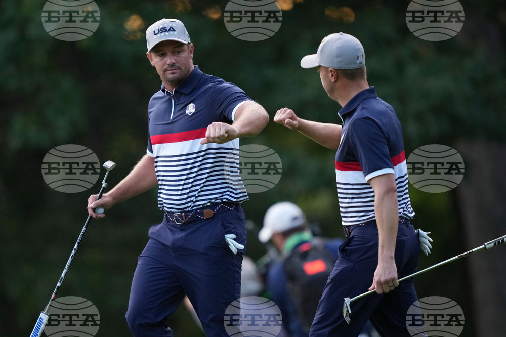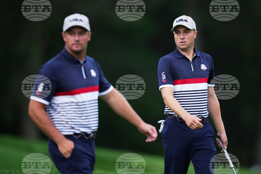 United States' Bryson DeChambeau and Justin Thomas walk on the second hole at Bethpage Black golf course during the Ryder Cup golf tournament, Friday, Sept. 26, 2025, in Farmingdale, N.Y. (AP Photo/Matt Slocum)