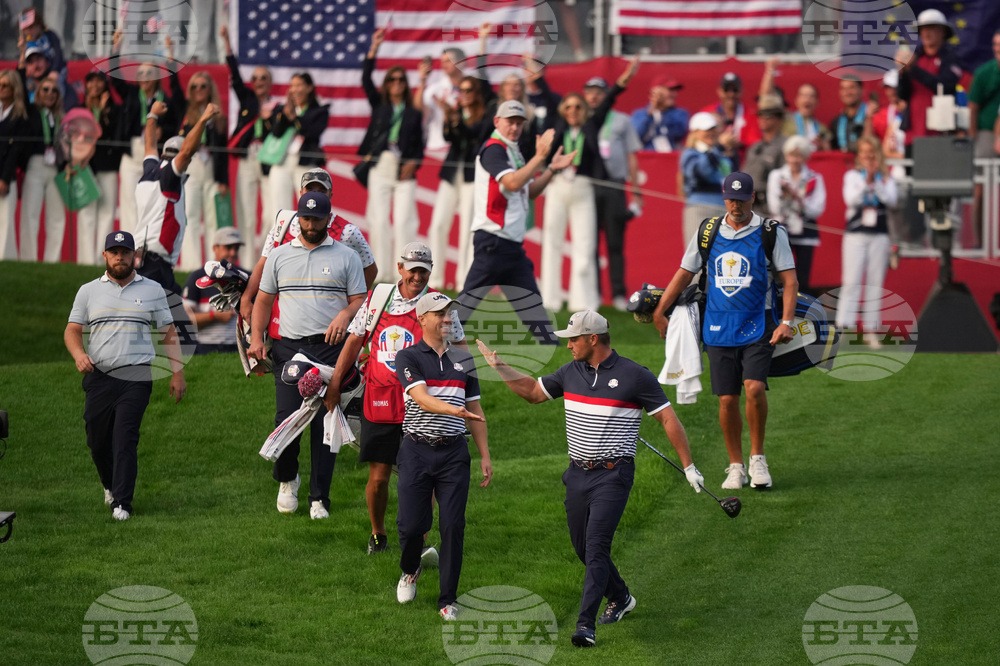 Europe's waves after making a putt on the first hole at Bethpage Black golf course during the Ryder Cup golf tournament, Friday, Sept. 26, 2025, in Farmingdale, N.Y. (AP Photo/Lindsey Wasson)