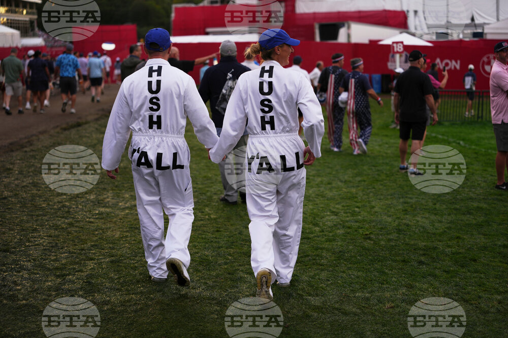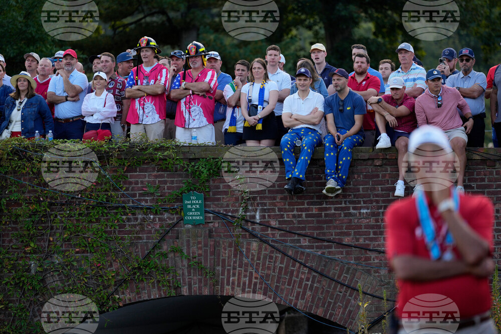 Fans watch on the ninth hole during a practice round at the Ryder Cup golf tournament, Thursday, Sept. 25, 2025, on the Bethpage Black golf course, in Farmingdale, N.Y. (AP Photo/Lindsey Wasson)