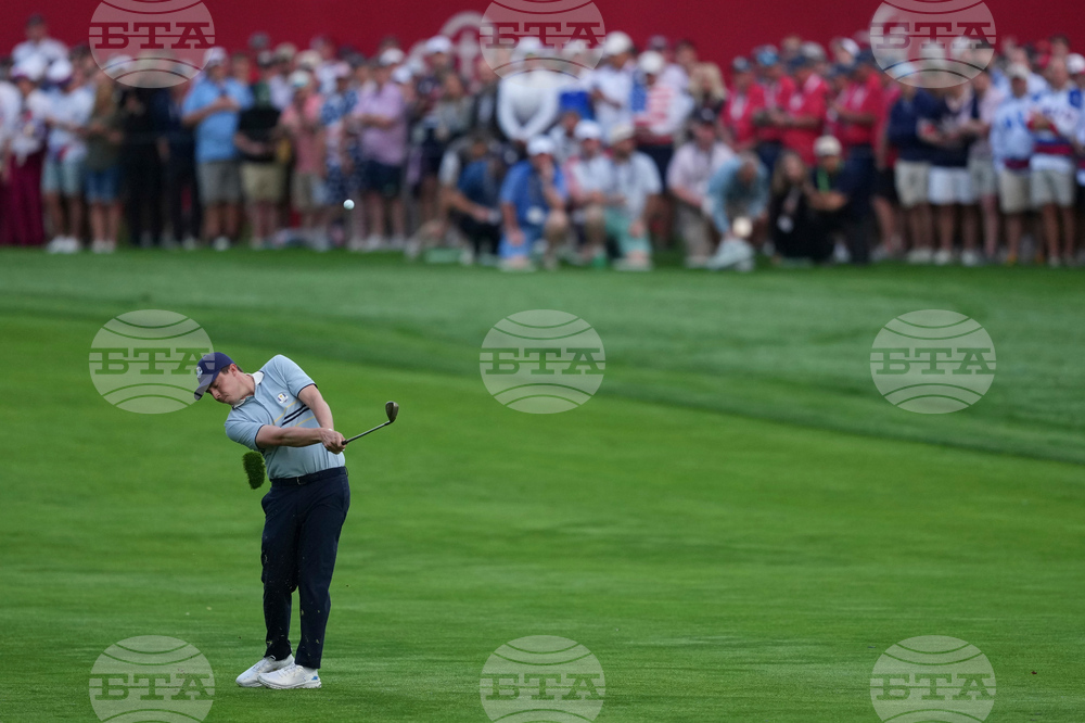 Matthew Fitzpatrick hits from the fairway on the first hole at Bethpage Black golf course during the Ryder Cup golf tournament, Friday, Sept. 26, 2025, in Farmingdale, N.Y. (AP Photo/Lindsey Wasson)
