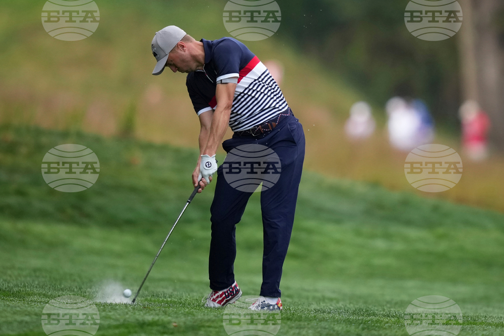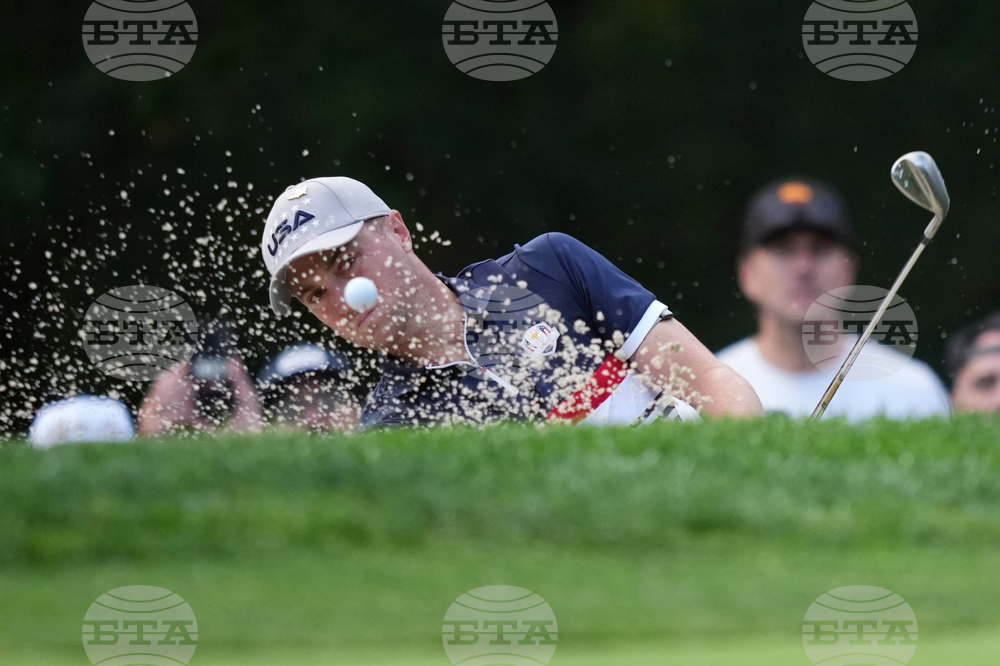 United States' Justin Thomas hits from the bunker on the third hole at Bethpage Black golf course during the Ryder Cup golf tournament, Friday, Sept. 26, 2025, in Farmingdale, N.Y. (AP Photo/Matt Slocum)