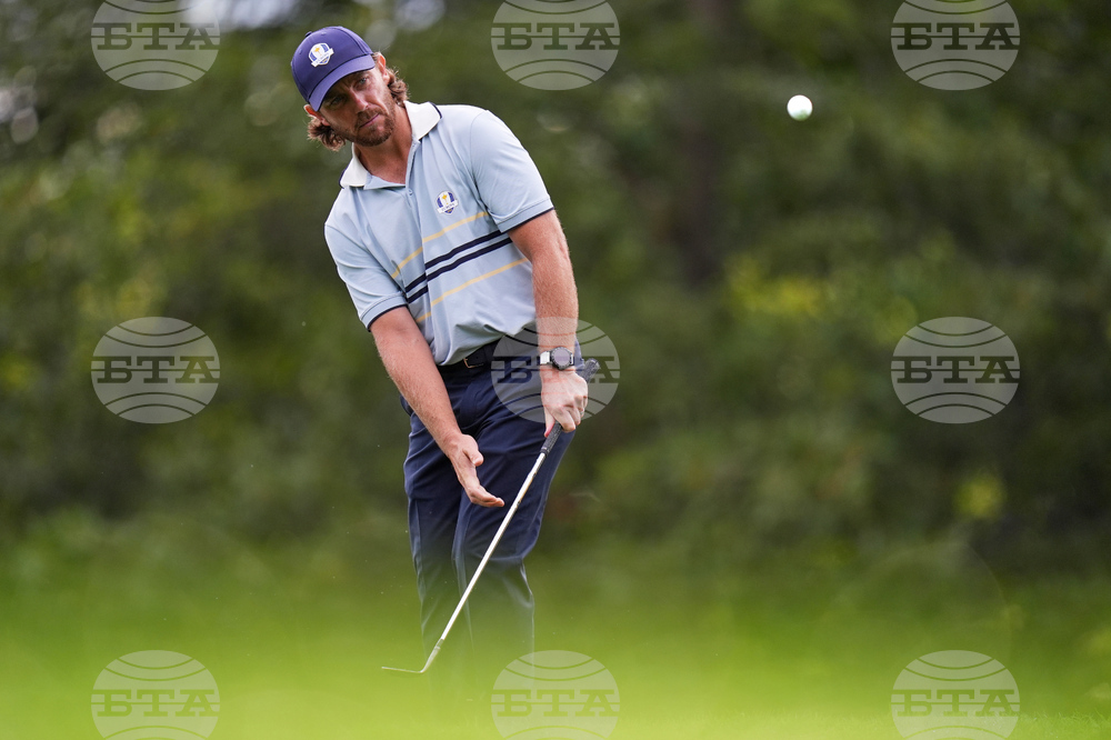 Europe's Tommy Fleetwood hits from the bunker on the fifth hole during a practice round at the Ryder Cup golf tournament, Thursday, Sept. 25, 2025, on the Bethpage Black golf course, in Farmingdale, N.Y. (AP Photo/Seth Wenig)