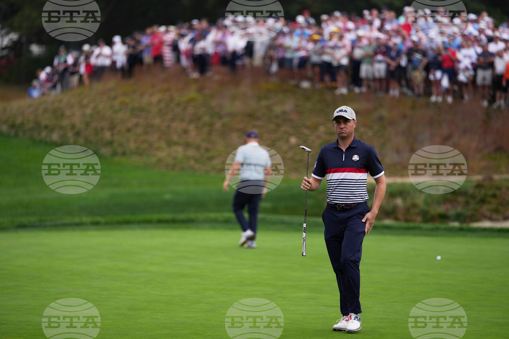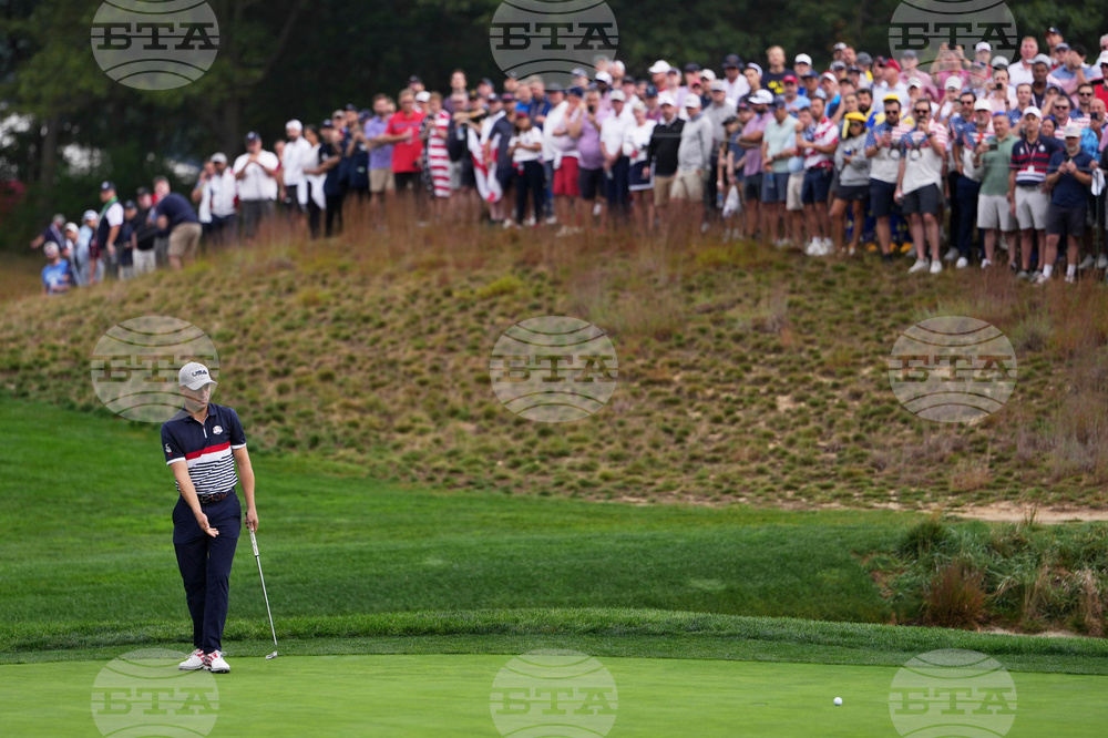 United States' Justin Thomas putts on the 16th hole during a practice round at the Ryder Cup golf tournament, Thursday, Sept. 25, 2025, on the Bethpage Black golf course, in Farmingdale, N.Y. (AP Photo/Matt Slocum)