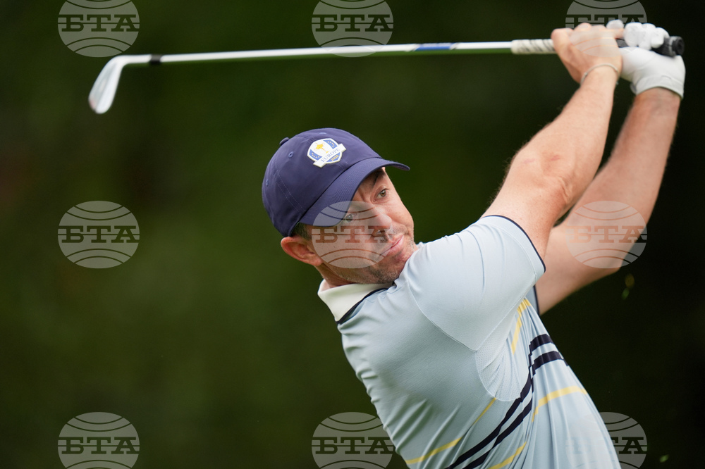 Europe's Rory McIlroy watches his tee shot on the seventh hole during a practice round at the Ryder Cup golf tournament, Thursday, Sept. 25, 2025, on the Bethpage Black golf course, in Farmingdale, N.Y. (AP Photo/Seth Wenig)