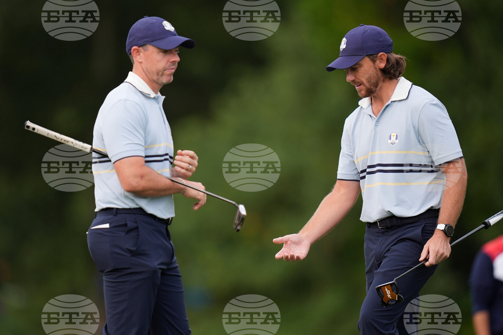 Europe's Rory McIlroy and Tommy Fleetwood talk on the second hole at Bethpage Black golf course during the Ryder Cup golf tournament, Friday, Sept. 26, 2025, in Farmingdale, N.Y. (AP Photo/Seth Wenig)