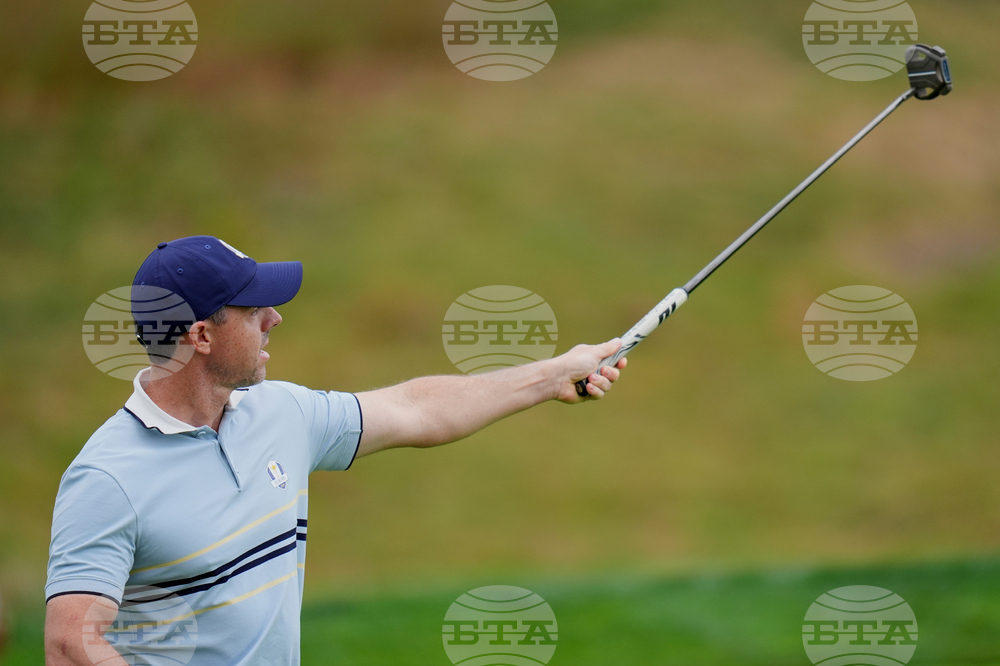 Europe's Rory McIlroy plays on the fifth hole during a practice round at the Ryder Cup golf tournament, Thursday, Sept. 25, 2025, on the Bethpage Black golf course, in Farmingdale, N.Y. (AP Photo/Lindsey Wasson)