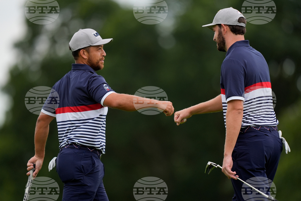 The United States' Scottie Scheffler, top, talks with Xander Schauffele during a team picture at the Ryder Cup golf tournament, Thursday, Sept. 25, 2025, on the Bethpage Black golf course, in Farmingdale, N.Y. (AP Photo/Lindsey Wasson)
