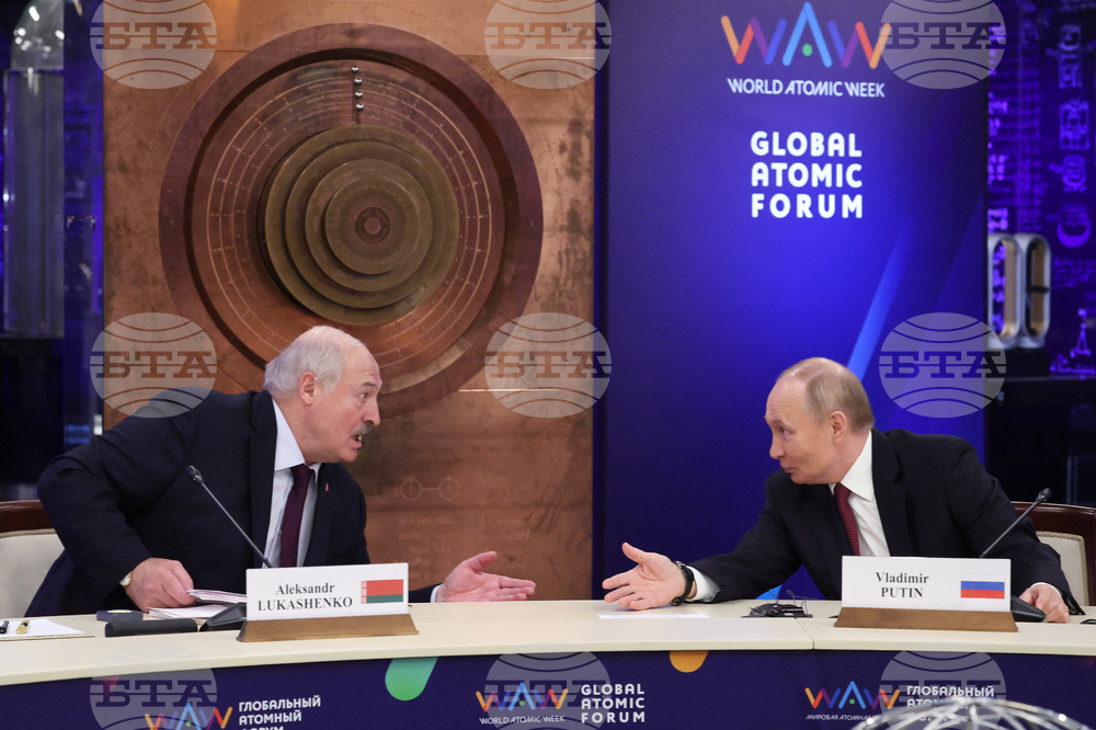 Belarusian President Alexander Lukashenko attends a session at the World Atomic Week forum at the Exhibition of Achievements of National Economy (VDNKh) in Moscow, Russia, Thursday, Sept. 25, 2025. (Evgenia Novozhenina/Pool Photo via AP)