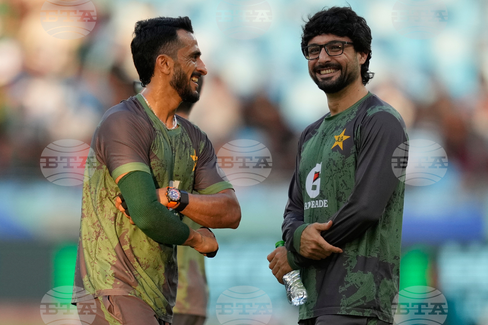 Pakistan's Hasan Ali, left, and Pakistan's Abrar Ahmed smiles during warm ups before the start of the Asia Cup Cricket match between Bangladesh and Pakistan at Dubai International Cricket stadium in Dubai, United Arab Emirates, Thursday, Sept. 25, 2025. (AP Photo/Altaf Qadri)