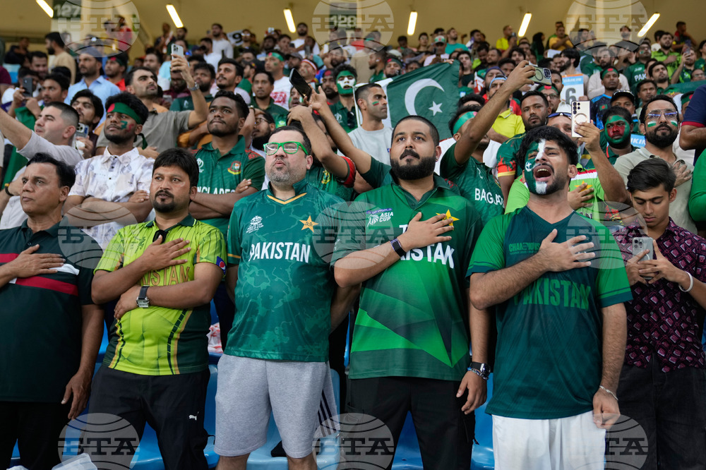 Pakistani fans sing national anthem during the Asia Cup Cricket match between Bangladesh and Pakistan at Dubai International Cricket stadium in Dubai, United Arab Emirates, Thursday, Sept. 25, 2025. (AP Photo/Altaf Qadri)