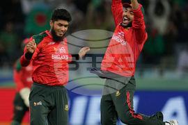 Bangladesh's Rishad Hossain, left, celebrates the dismissal of Pakistan's Sahibzada Farhan during the Asia Cup Cricket match between Bangladesh and Pakistan at Dubai International Cricket stadium in Dubai, United Arab Emirates, Thursday, Sept. 25, 2025. (AP Photo/Altaf Qadri)