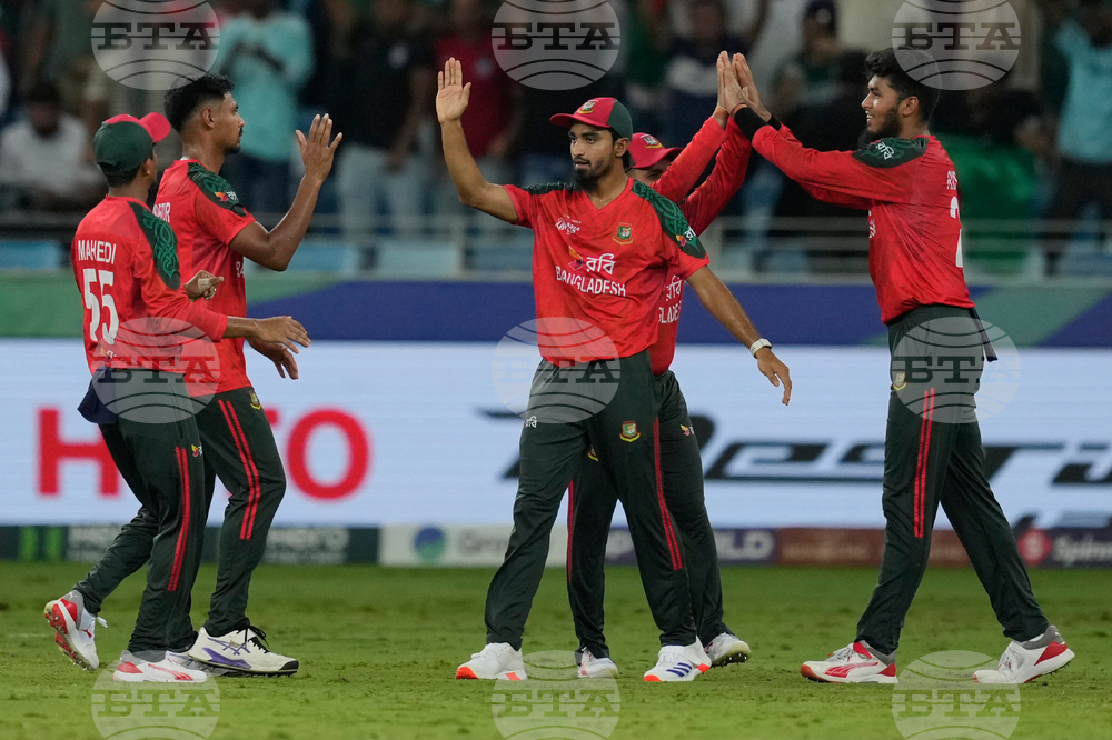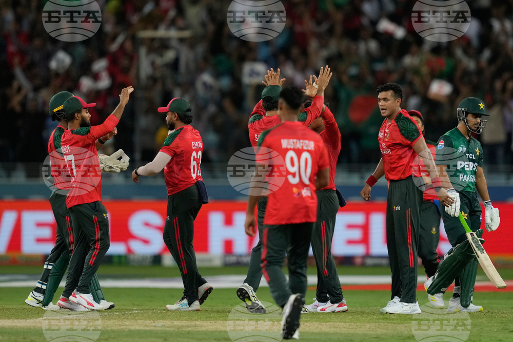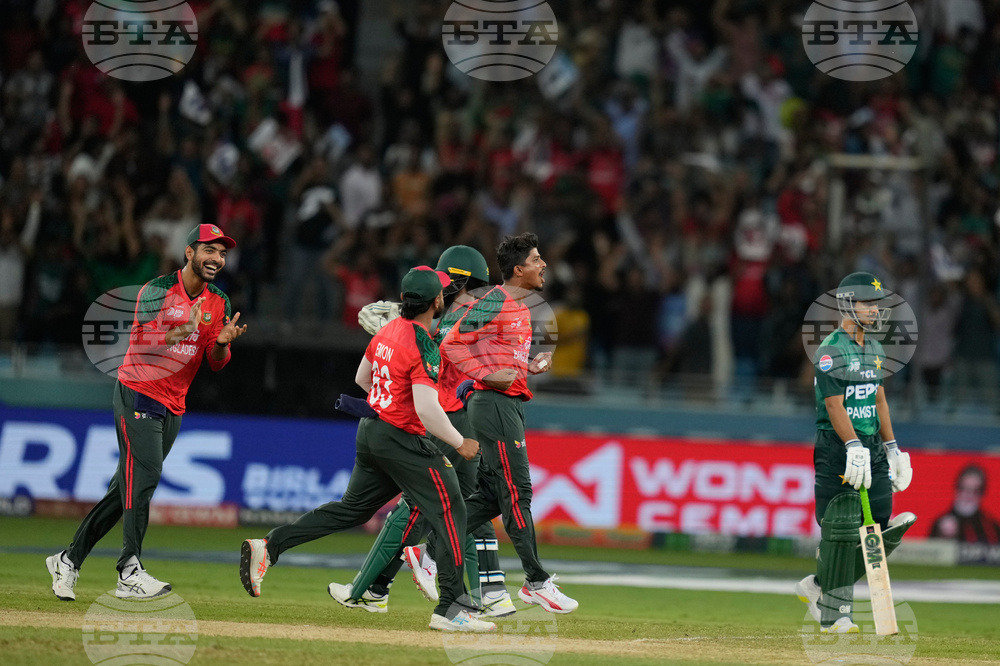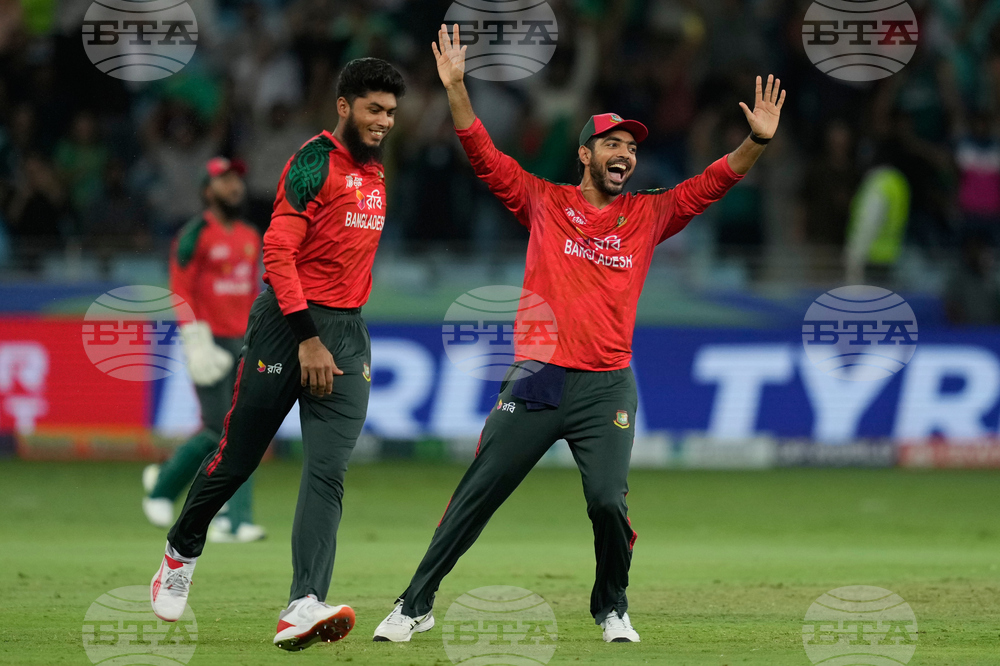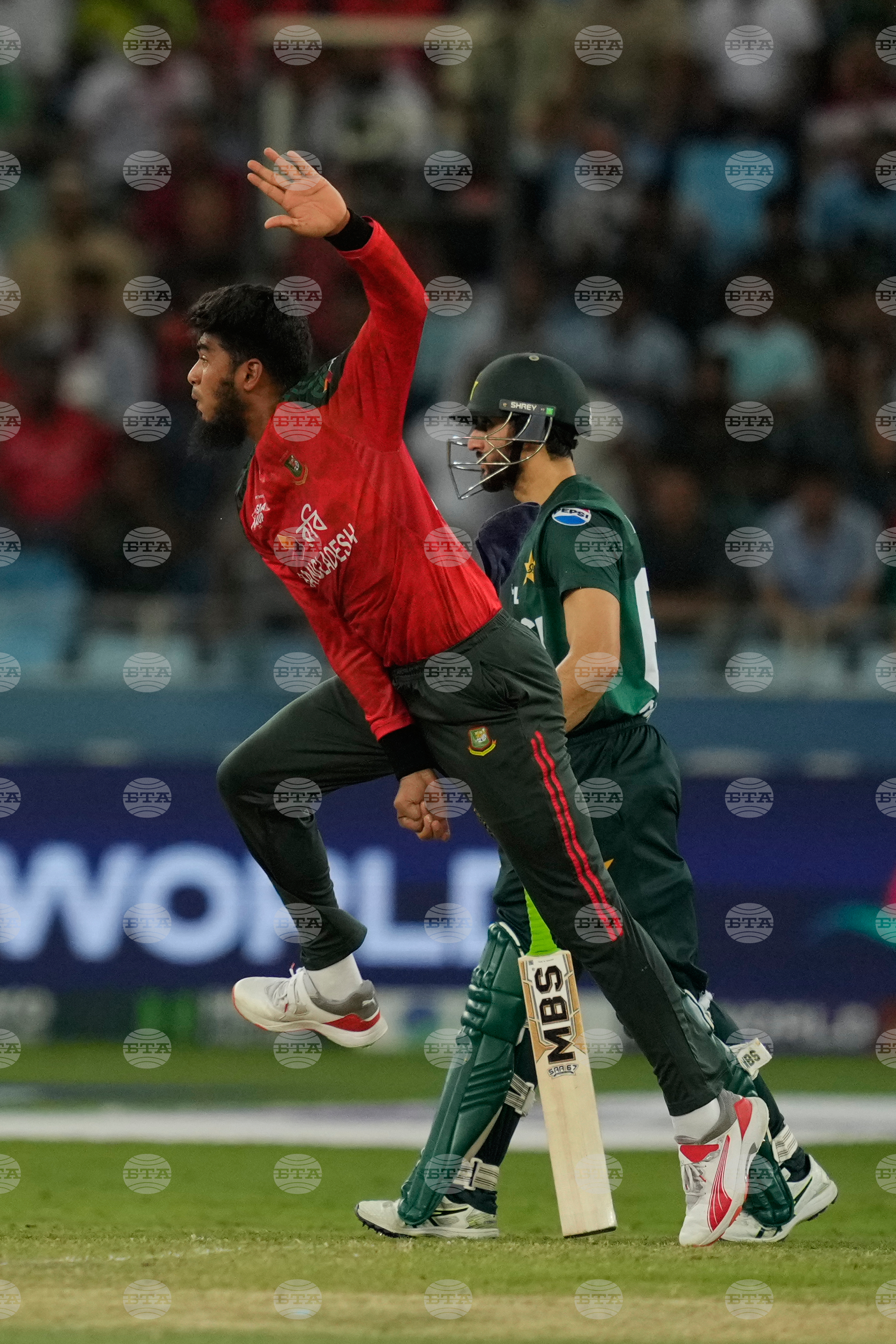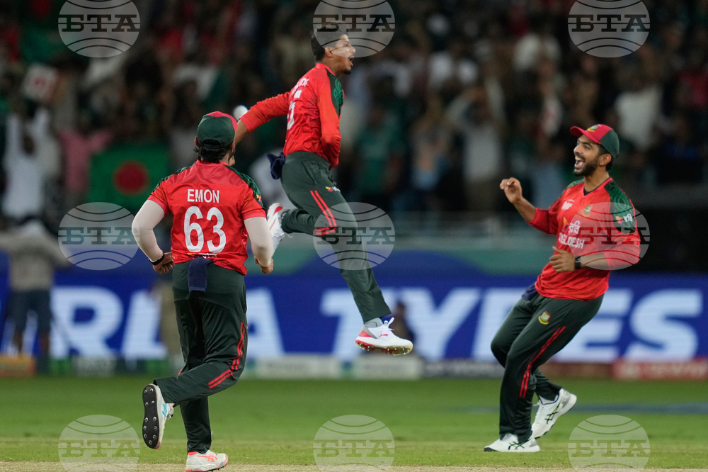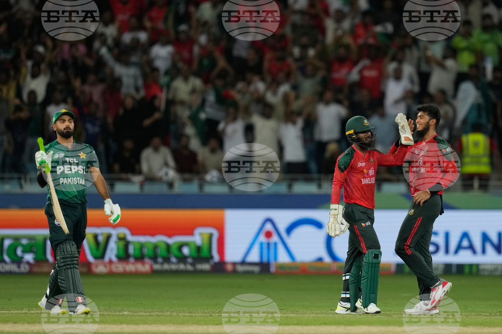 Bangladesh's players celebrate the dismissal of Pakistan's Fakhar Zaman during the Asia Cup cricket match between Bangladesh and Pakistan at Dubai International Cricket stadium in Dubai, United Arab Emirates, Thursday, Sept. 25, 2025. (AP Photo/Altaf Qadri)
