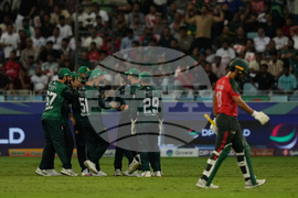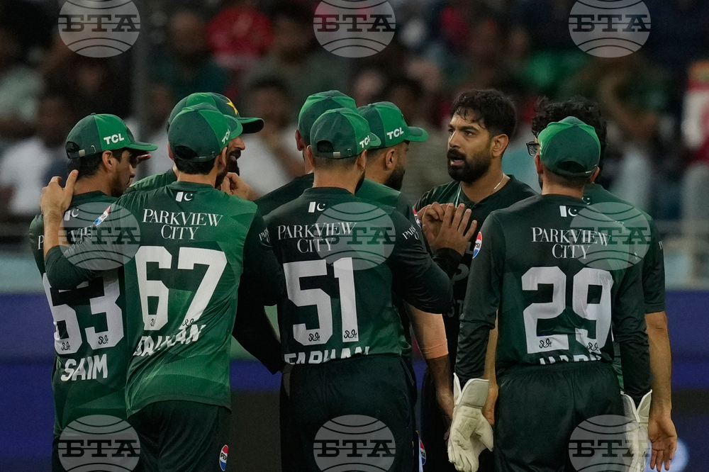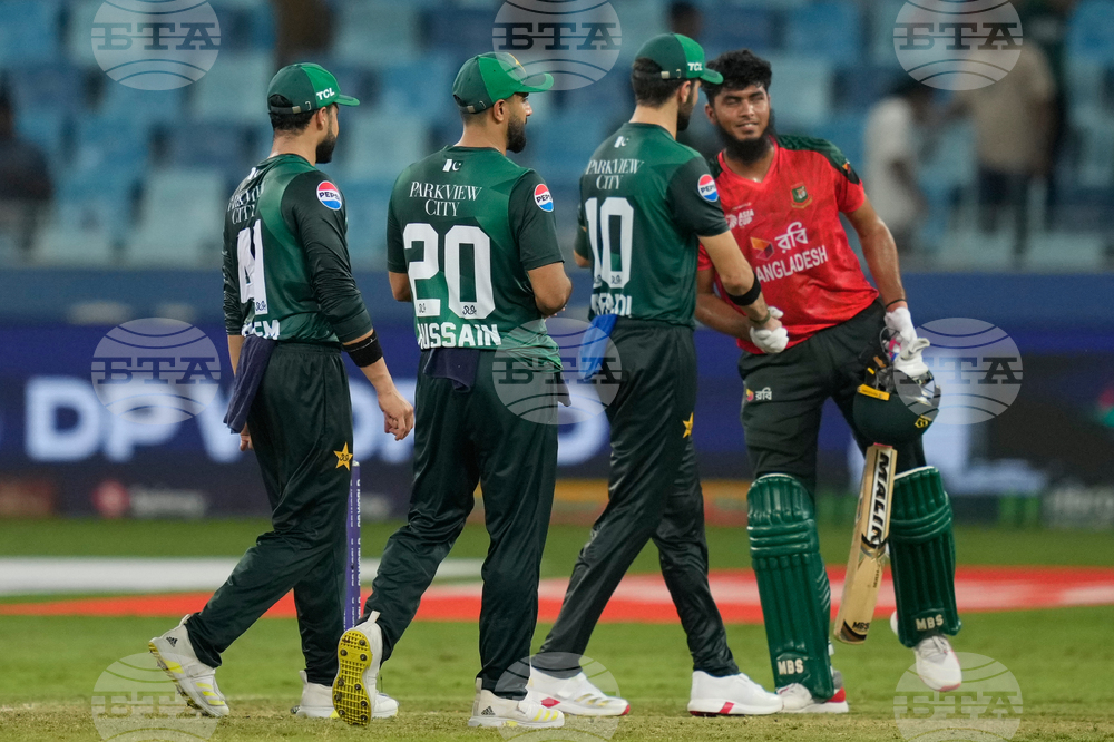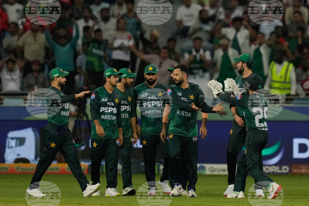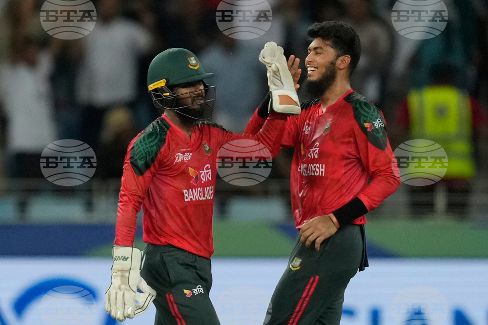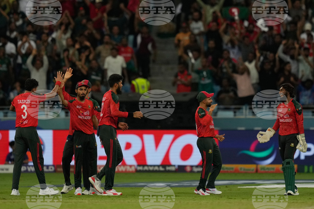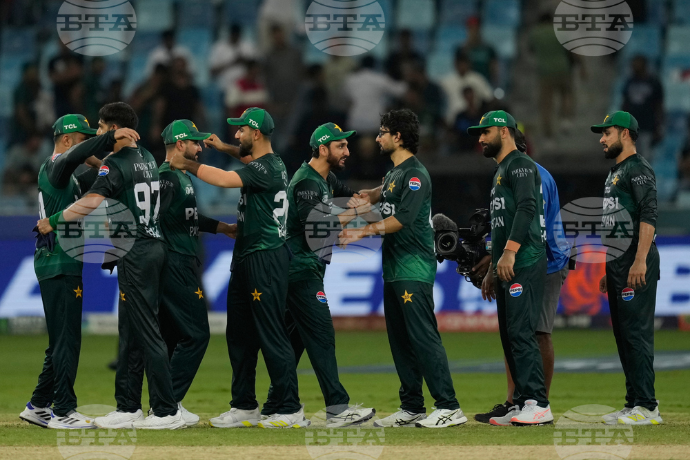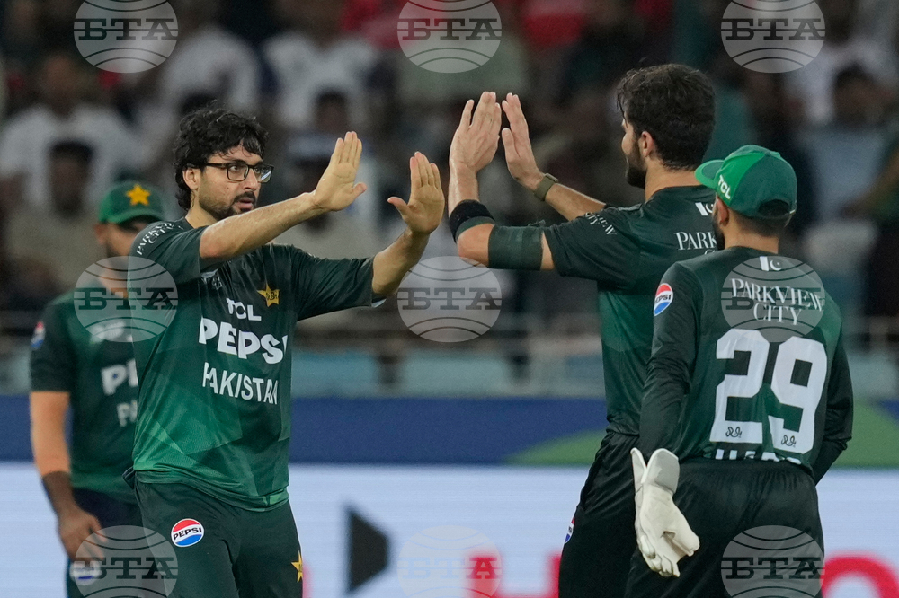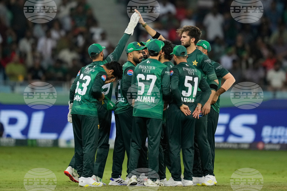 Bangladesh's players celebrate the dismissal of Pakistan's Fakhar Zaman during the Asia Cup cricket match between Bangladesh and Pakistan at Dubai International Cricket stadium in Dubai, United Arab Emirates, Thursday, Sept. 25, 2025. (AP Photo/Altaf Qadri)