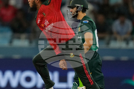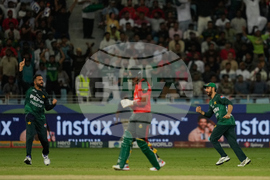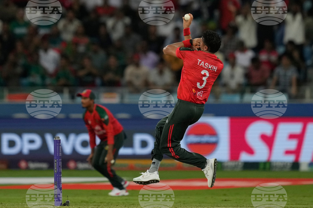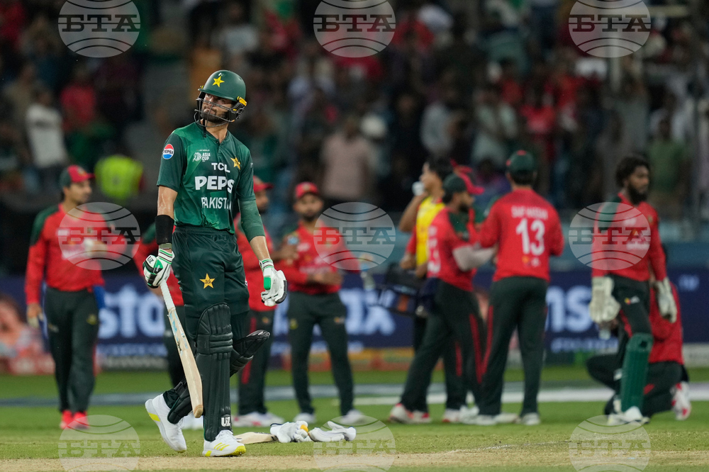 Bangladesh's Taskin Ahmed bowled out by Pakistan's Haris Rauf during the Asia Cup cricket match between Bangladesh and Pakistan at Dubai International Cricket stadium in Dubai, United Arab Emirates, Thursday, Sept. 25, 2025. (AP Photo/Altaf Qadri)