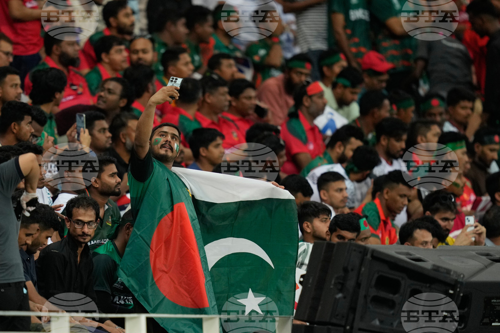 Fans stand during national anthem of both teams during the Asia Cup Cricket match between Bangladesh and Pakistan at Dubai International Cricket stadium in Dubai, United Arab Emirates, Thursday, Sept. 25, 2025. (AP Photo/Altaf Qadri)