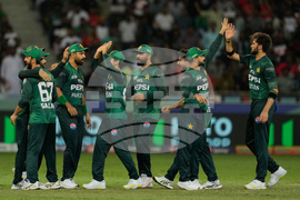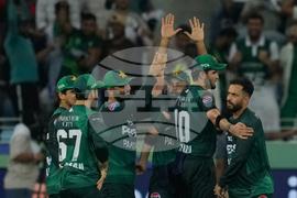 Pakistan's players celebrate their team's victory during the Asia Cup cricket match between Bangladesh and Pakistan at Dubai International Cricket stadium in Dubai, United Arab Emirates, Thursday, Sept. 25, 2025. (AP Photo/Altaf Qadri)